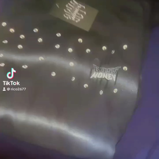 a black, bottom cut, rhinestone bossmoney2677 logo shirt
